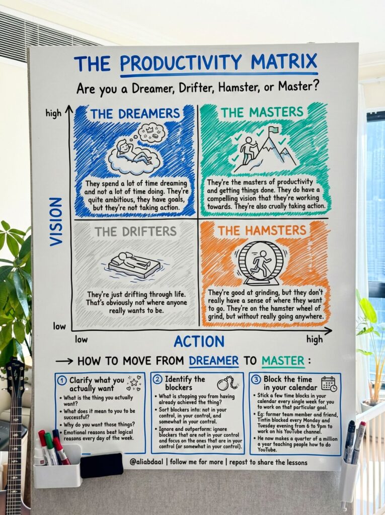စွမ်းဆောင်ရည် မက်ထရစ် (Productivity Matrix) ရည်မှန်းချက် (Vision) နှင့် လက်တွေ့လုပ်ဆောင်မှု (Action) တို့အပေါ် အခြေခံ၍ လူ ၄ မျိုး ခွဲခြားထားပါသည်။